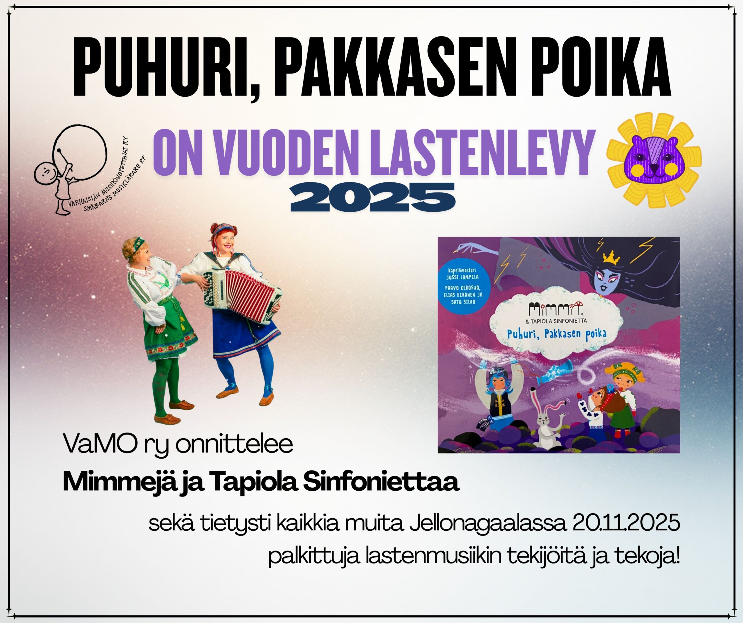 Vuoden lastenlevy 2025 julkistettiin Jellonagaalassa Oulussa 20.11.2025.